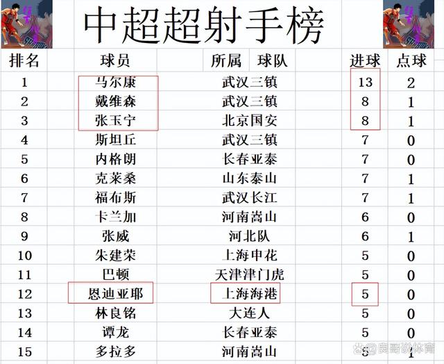 射手榜方面,前十完全没有变化,马尔康13球领跑,戴维森,张玉宁8球并列第2,斯坦丘,内格朗,克莱桑,福布斯7球并列第4。恩迪亚耶未能抓住良机破门,还是5球刚好挤入前十。