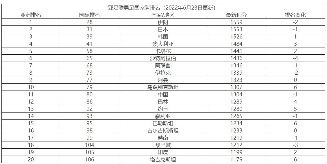 2022年亚洲各国男子足球队排名情况(图文解说)
