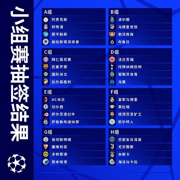 8月26日讯 2022-23赛季欧冠抽签,小组赛分组结果如下。