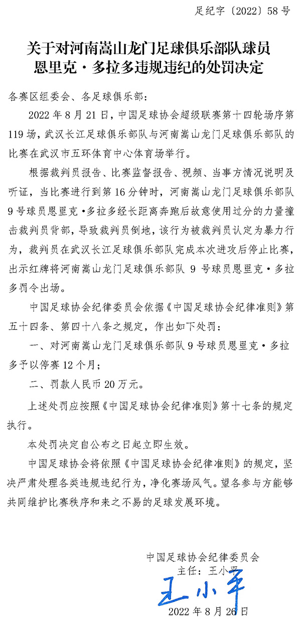8月26日上午,中国足协在其官网公布对于河南嵩山龙门外援多拉多的处罚结果公告,多拉多被处以12个月的禁赛以及罚款20万。