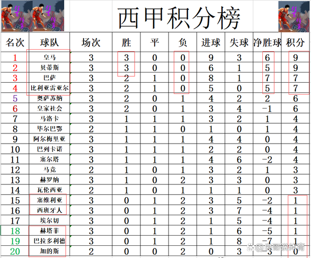 积分榜方面,黄潜无力赢球后,3轮过后西甲就仅剩皇马和贝蒂斯两支全胜球队,皇马1个净胜球优势力压贝蒂斯登顶。巴萨大胜夺取2连胜后则是以净胜球优势力压黄潜杀入前3,黄潜跌至第4。赫塔菲,巴利亚多利德依然是陷在降级区。
