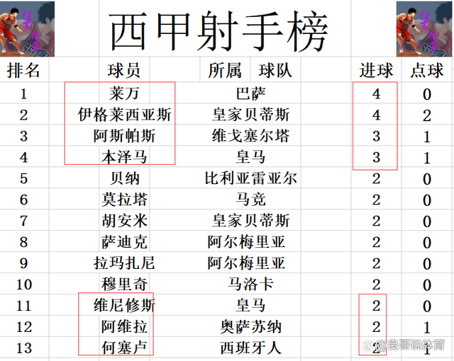 射手榜方面,似乎要渐渐进入莱万,本泽马争霸的局面了,莱万连场双响追上伊格莱西亚斯4球并列第1,本泽马连场破门3球追上阿斯帕斯并列第3。维尼修斯,何塞卢进球后则是追上胡安米等人2球挤入前十。