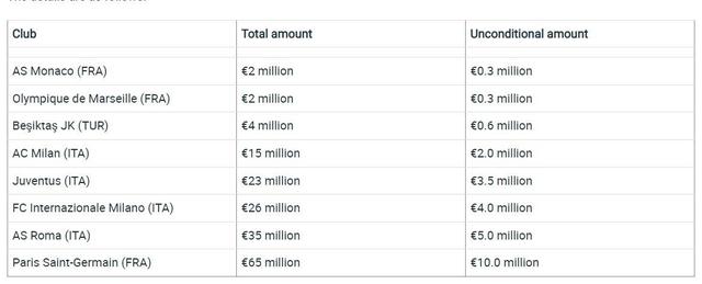 八大俱乐部分别是:AC米兰、国际米兰、尤文图斯、罗马、巴黎圣日耳曼、摩纳哥、马赛和贝西克塔斯!而处罚手段也非常柔和,这些款项将从这些俱乐部参加欧足联俱乐部比赛或直接支付的任何款项中扣缴,只有15%需要俱乐部全额支付,和解协议的期限为3年或4年!