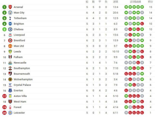 曼城队在本轮意外被维拉逼平,球队无缘超越阿森纳登顶,目前曼城4胜2平积14分,仍旧排在积分榜第2的位置。热刺队取胜之后积分同样达到14分,净胜球劣势排在曼城之后位列第3。切尔西本轮取胜之后积分达到10分,暂时上升到联赛第5位。利物浦2胜3平1负积9分,暂列积分榜第6的位置。大胜之后的布伦特福德同样积分达到9分,暂时排在第7位。