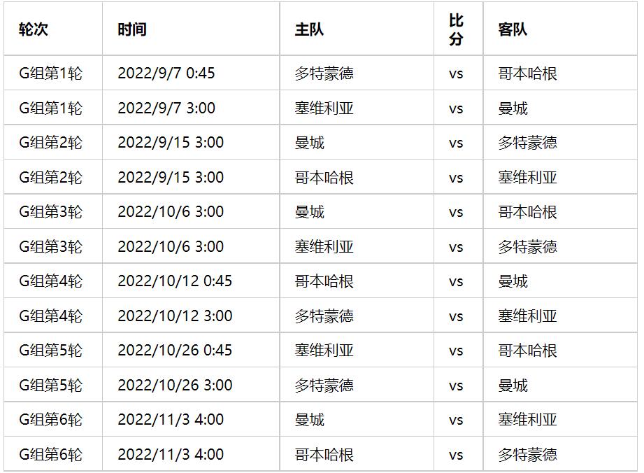 欧冠联赛G组名单及对决时间统计表2022-2023赛季 2022-2023赛季欧冠联赛32强小组赛抽签结束,G组名单有曼城、塞维利亚、多特蒙德、哥本哈根。下面我们就来查看下G组4支球队的赛程时间安排吧。 欧冠联赛G组名单及对决时间统计表2022-2023赛季 Tags: