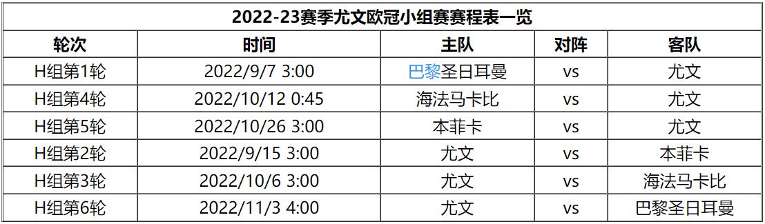 2022-2023赛季欧冠联赛尤文图斯队小组赛比赛时间一览