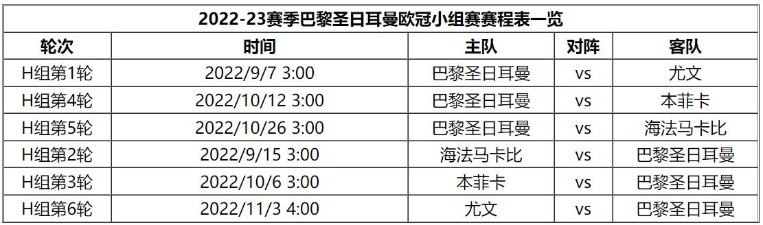 欧冠联赛2022-2023赛季巴黎圣日耳曼队小组赛比赛时间一览