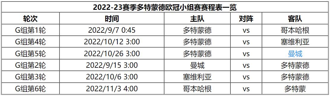 欧冠联赛2022-2023赛季多特蒙德队小组赛比赛时间一览
