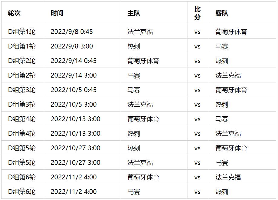 2022-2023年欧冠联赛D组有几场比赛?2022-2023赛季欧冠联赛32强小组赛抽签结果出炉,其中D组有法兰克福、托特纳姆热刺、葡萄牙体育、马赛。下面我们就来了解下这4支球队的比赛时间安排吧。