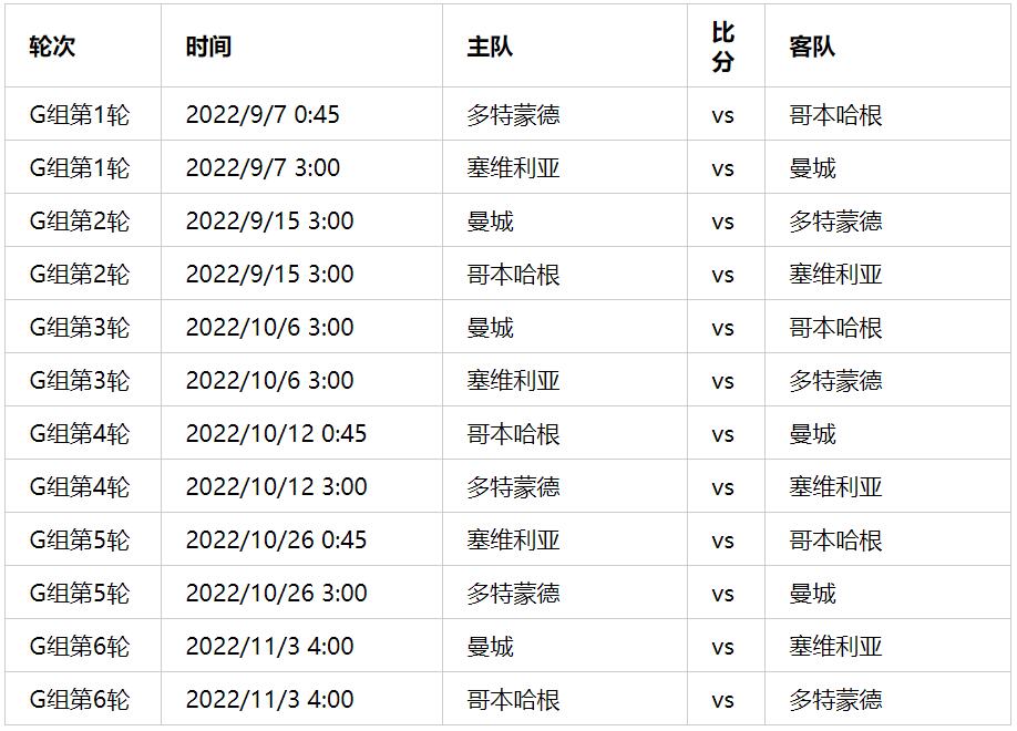 2022-2023年欧冠联赛H组4支球队主客场比赛安排