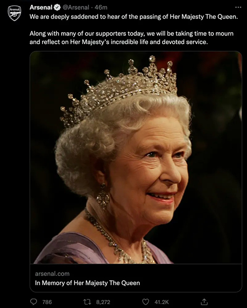 另据报道,凌晨时分参加欧联杯比赛的英超各俱乐部都对女王的去世表示了哀悼。其中阿森纳全队是在比赛中获悉女王离去的消息的,因此下半场开始前,阿森纳和对手瑞士苏黎世队的球员都列队表示默哀。据悉女王生前是阿森纳球迷,但她从未公开表示这一点,还有消息称他是西汉姆联队的球迷。除了阿森纳的这场比赛,稍后进行的曼联主场对皇家社会以及西汉姆联队主场对布加勒斯特星队的比赛,赛前也都进行了默哀。