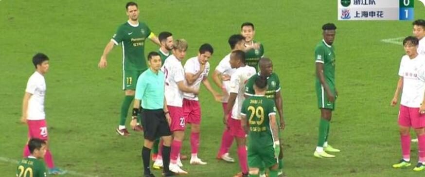 下半场,第84分钟,浙江队打门被曾诚扑出,他们顺势继续找补射机会,但被申花一一防下,但浙江队围住了主裁,认为对手有手球,主裁在听耳机,VAR随后介入,大屏幕多角度回放后,主裁确认曹赟定手球,给了浙江队点球,曹赟定内心火起,直接向裁判发难,一脸怒气冲着裁判念念有词,裁判很淡定,丝毫没受影响。