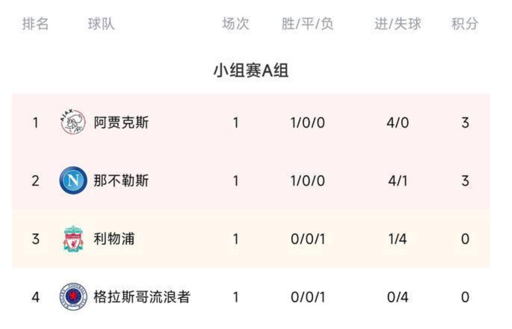 积分榜方面,阿贾克斯积3分居首,那不勒斯3分第二,利物浦0分第三,流浪者垫底。
