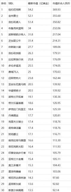 市值最低的是新奥尔良鹈鹕队,其市值为13.5亿美金。