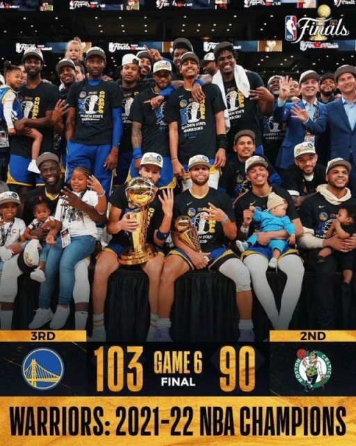2021-2022赛季美职篮总决赛第六场,金州勇士客场103:90战胜波士顿凯尔特人,以总比分4:2夺得总冠军。