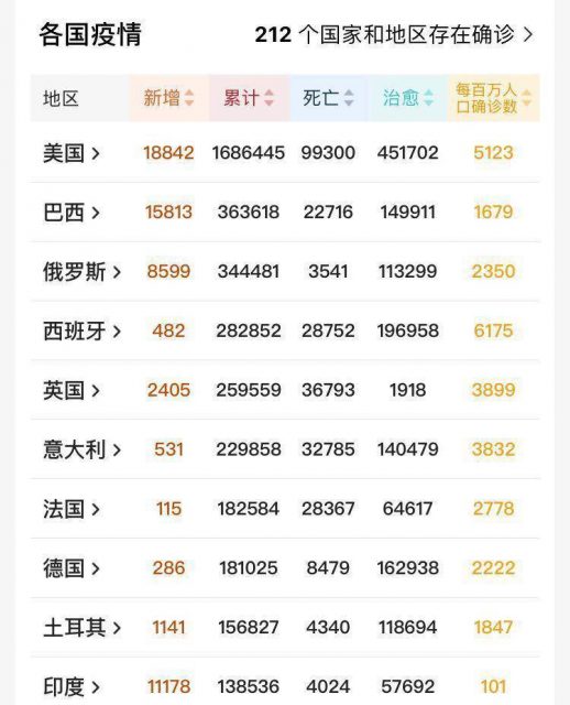 北京时间8月25日,根据实时数据显示,美国在过去的一天新增确诊18842例,累计1686445例,死亡累计达到了99300例,接近了10大关,是全球迄今为止因感染新冠病毒而死亡的人数最多的国家。