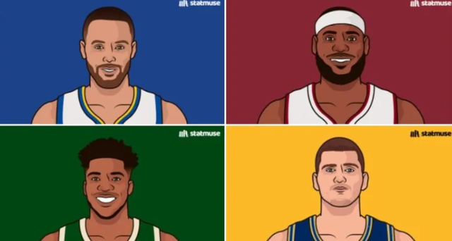 这4位球员分别是库里、詹姆斯、阿德托昆博、约基奇!先来介绍一下库里吧,自2009年进入联盟,在2014-15赛季和2015-16赛季拿到了MVP。其中15-16赛季更是拿到了全票的MVP,这年的他场均能够拿到30.1分,且命中了402记3分!