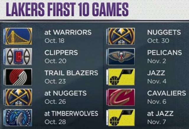 根据联盟赛程安排,湖人前10场的对手分别为:勇士(客场)、快船(主场)、开拓者(主场)、掘金(客场)、森林狼(客场)、掘金(主场)、鹈鹕(主场)、爵士(主场)、骑士(主场)、爵士(客场)。除了骑士(附加赛)、快船(附加赛)、开拓者之外,剩下的对手均是上赛季的季后赛球队。实话实说,确实有点难,湖人今夏大面积换血,主教练也换人,他们一定需要一个磨合期,但是到目前为止,威少还留在球队,形势不太明朗,距离训练营开启只剩下6周左右的时间,一开始就打各路豪强,湖人凶多吉少,这比上赛季的赛程难度还要大。