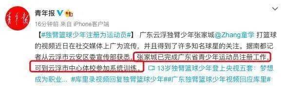 中国独臂篮球少年张家城已经完成了