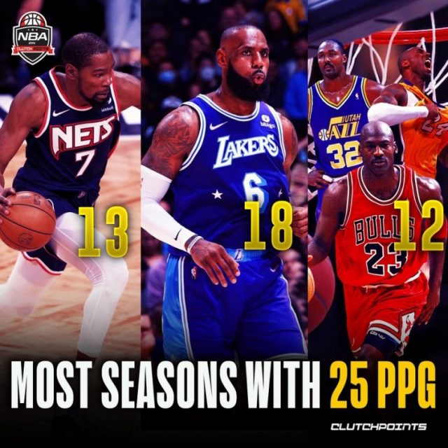 其中,詹姆斯18个赛季场均25+排名第一,杜兰特以13个赛季25+排名第二,乔丹,科比及卡尔-马龙则以12赛季并列排在第三位。