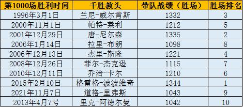 通过数据梳理发现,刚好有10位教练达到千场胜利,具体见下表: