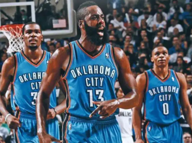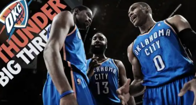 雷霆三少最初由杜兰特、威斯布鲁克和杰夫格林在2010年左右组成的雷霆队三人组,而大家比较熟悉的雷霆三少,是哈登接替了格林的位置,之后所成立的新雷霆三少。2012年总决赛输给热火后,哈登被交易,雷霆三巨头解散。雷霆三少最厉害的地方就是三人都打出了MVP的水准,尤其是杜兰特,将常规赛MVP、得分王、总冠军、总决赛MVP合二为一,险些实现了荣誉大满贯。