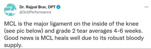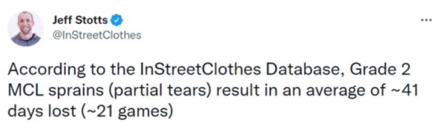 两位医学专家也对亚历山大的伤情进行解读。专家Brar表示,内侧副韧带二级扭伤平均康复时间是4-6周。好消息是这一位置的供血充足,有利于康复速度。专家Strotts表示,数据显示,内侧副韧带二级扭伤(部分撕裂)在NBA平均康复时间是41天,换算成比赛,就是大约21场比赛。不过,亚历山大不是在赛季期间受伤,预计不会错过那么多场比赛。
