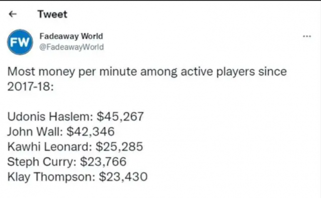 根据著名美媒《Fadeaway World》的统计,他们给出了现役球员中,从2017-2018赛季到上赛季期间,在场上平均每分钟拿到的工资排行榜。库里、汤普森位列第四、第五名,前两位完全就是躺着挣钱,下面我们来一起看看具体都有谁?