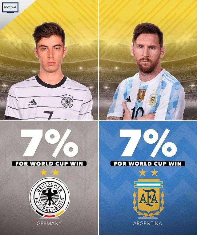 排在第7位的球队有两支,他们分别是德国队以及阿根廷队,两队的夺冠概率都是7%。德国队如今在弗里克的带领之下,有了复兴的迹象。虽然还不足以被称之为大热门,但在世界杯上他们是任何球队都不想碰到的对手。至于阿根廷队,现在的阿根廷排在第五其实是有些被低估了。他们均衡的前中后场,再加上梅西等人的稳定状态。潘帕斯雄鹰的硬实力绝对能够挤进现在国家队的前三。