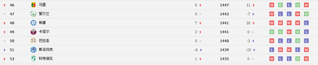 目前国际足联的世界排名。第51位(2022年3月),6月已上升至第49位