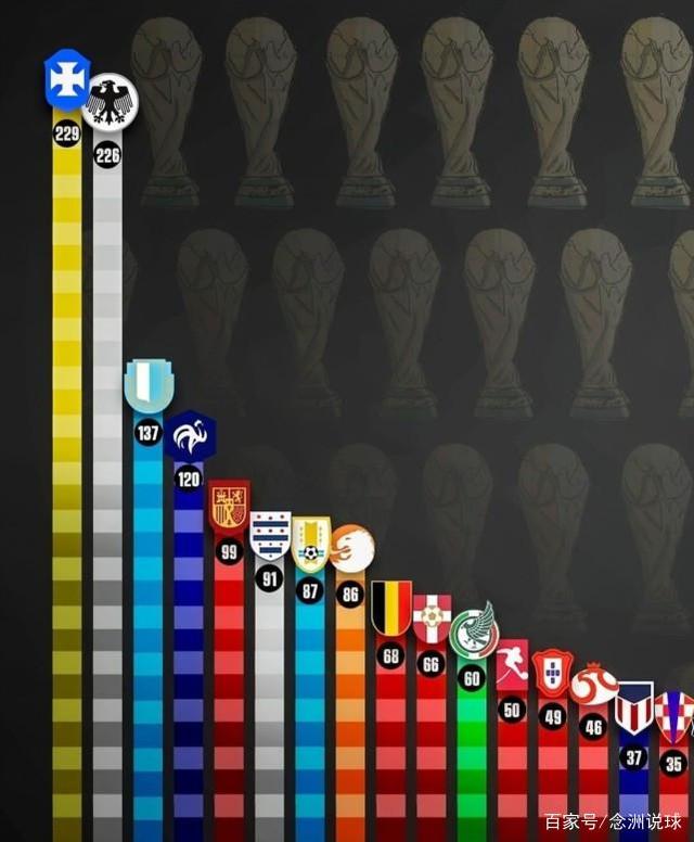 第三名是阿根廷,18次参加世界杯收获137球。第四名是法国,16次参加世界杯攻入120球——突破百球大关的国家队,也就是以上这四支了。