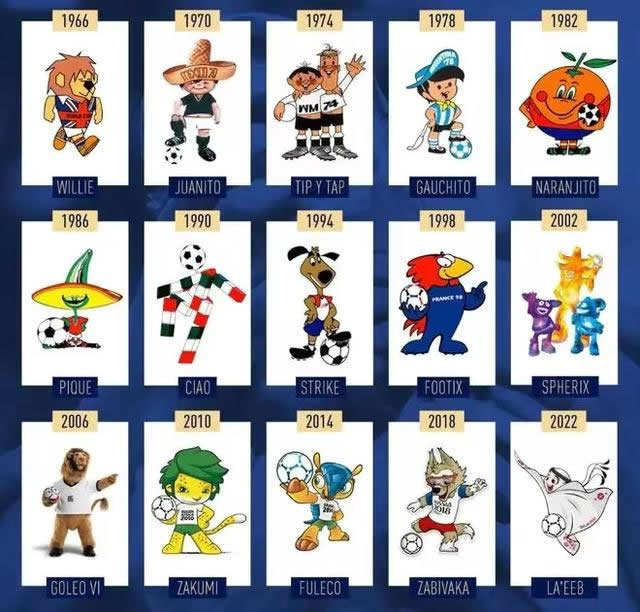 1966年,在英格兰举行的世界杯上,首次出现了官方吉祥物,形象是一只踢球的狮子,名叫威利。此后的每届世界杯,主办国都会在赛前发布代表主办国特色的吉祥物,给世界杯增添了很多趣味和色彩。快来看看你更喜欢哪一界的世界杯吉祥物吧。