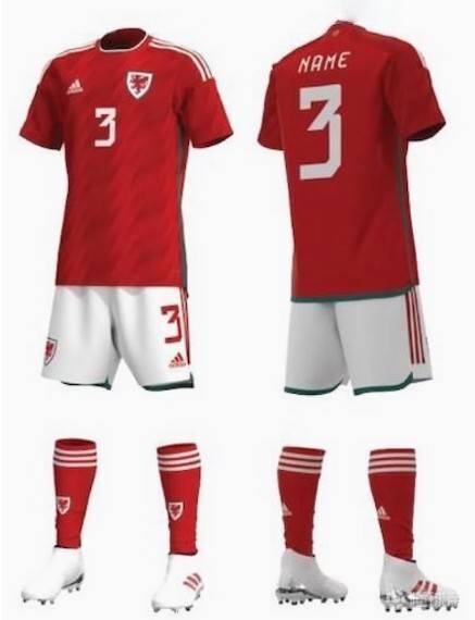 2022卡塔尔世界杯威尔士队主场球衣设计简约,以红色为底色,肩部饰有白色三道杠条纹,圆领上有一些白色饰边,阿迪达斯的新标志也是白色的,队徽位于胸部左侧。
