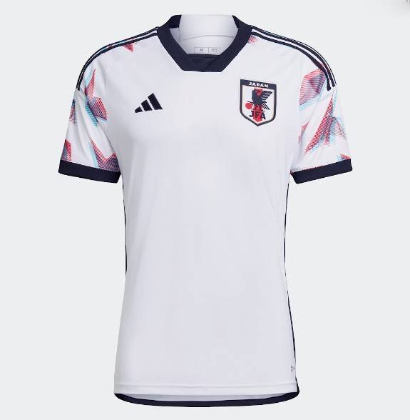 2022年卡塔尔世界杯日本队客场球衣现代风的外观,以白色为主,领口、袖口和阿迪达斯标志采用海军蓝色。是阿迪达斯品牌设计的。
