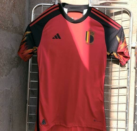 2022年卡塔尔世界杯比利时队主场球衣以红色为主,带有黑色徽标和饰边,袖子上印有火焰图案。是阿迪达斯品牌设计的。
