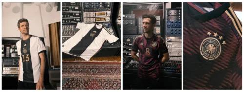 德国队主场球衣胸前热转印队徽以金色细节修饰,衣身缀醒目竖条纹——该设计灵感来自德国队首款球衣,并致敬德国的赛车文化。通过在极简设计中穿插充满激情的速度元素,旨在演绎专属德国队的运动优雅美学。衣领细节和衣身两侧以德国国旗配色呈现。客场球衣同样采用德国国旗配色,添加“Deutschland”(德国)中的“D”字样并采用模糊处理,力求承载德国队的精神传承,传递球队的活力风采。