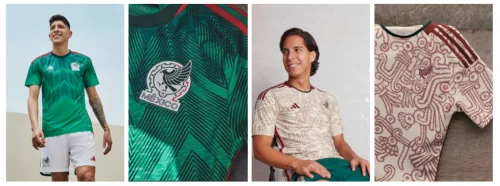 墨西哥队主场球衣的设计灵感来自当地文化中的羽蛇神。在当地神话中,羽蛇神被信奉为生命之神,传说是世界的创造者。此设计希望借羽蛇神独特的力量,旨在激励墨西哥国家队在2022年世界杯战无不胜,所向披靡。墨西哥客场球衣融入了米斯特克民族艺术,旨在致敬墨西哥古老文明,激发球员斗志。球衣全身设计醒目,内领点缀羽蛇神蛇身图案,该神裔可以追溯至前哥伦布时期,象征着人类强悍的身体素质,激励球队在世界杯中突破壁垒,创造佳绩。