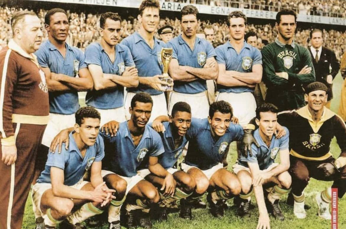 1958年瑞典世界杯,巴西5胜1平轻松夺得雷米特金杯,也是第一次夺魁,当时年仅17岁的贝利以及加林查为巴西队夺冠立下了汗马功劳。巴西队经典的4-2-4阵型震惊了全世界,贝利、加林查、迪迪、瓦瓦等巨星通过完美的表演令人信服的夺走雷米特女神金杯。