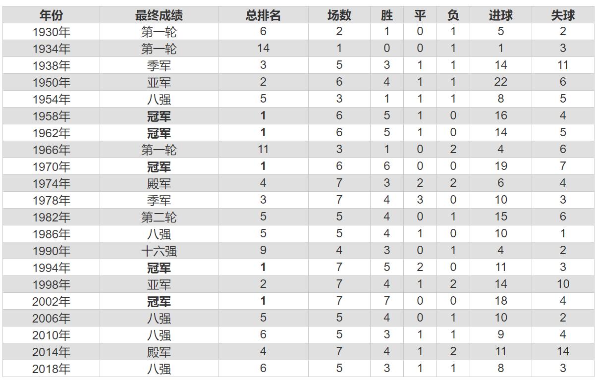 巴西历届世界杯历史战绩