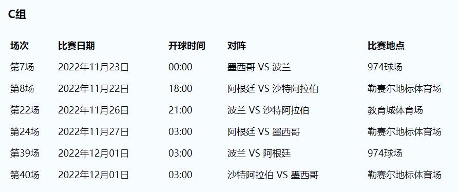 C组的四支球队分别是阿根廷、沙特、墨西哥、波兰。