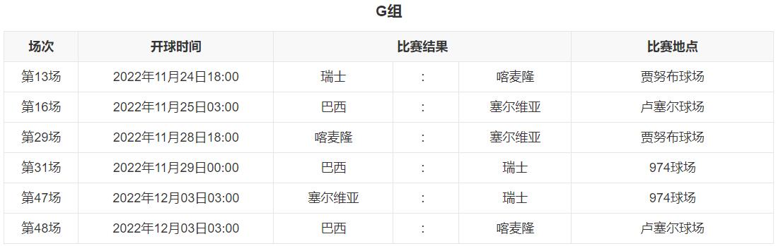 卡塔尔世界杯2022年小组赛g组四支球队在哪比赛 2022年世界杯将于11月20日至12月18日在卡塔尔举行,2022年世界杯有32支球队组成8个小组,每组4支球队。下面我们就来介绍下g组四支球队比赛时间及场馆吧。 G组:巴西、塞尔维亚、瑞士、喀麦隆 Tags: