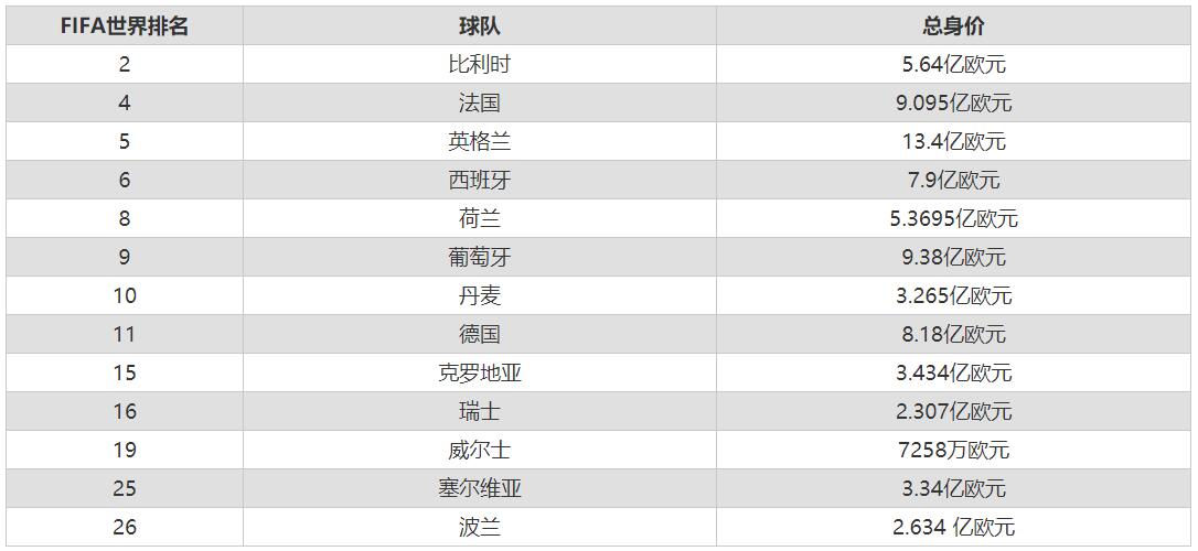 英格兰以13.4亿欧元身价排名第一,在英超户口本的加持下,可以说球员身价的水份很大,再少个20%会比较合理。上届世界杯冠军法国以9亿欧元排名第二,其中姆巴佩1.6亿欧的身价一骑绝尘。身价排名垫底的是威尔士队,只有7000万欧元,威尔士除了大家熟知的贝尔以外,能叫出名字的少之又少,威尔士能时隔64年后重返世界杯,贝尔功不可没,这也是贝尔最后一届世界杯了。